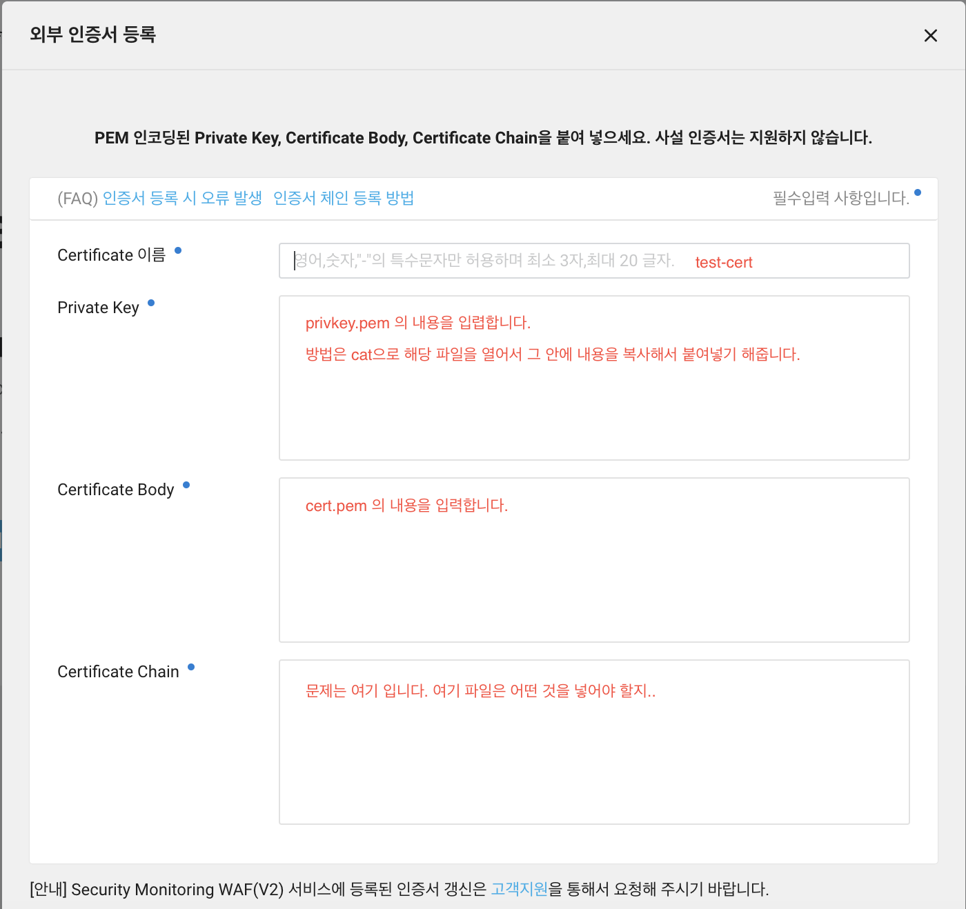 위 파일들의 내용을 입력하여 certficate manager를 설정하게 됩니다.