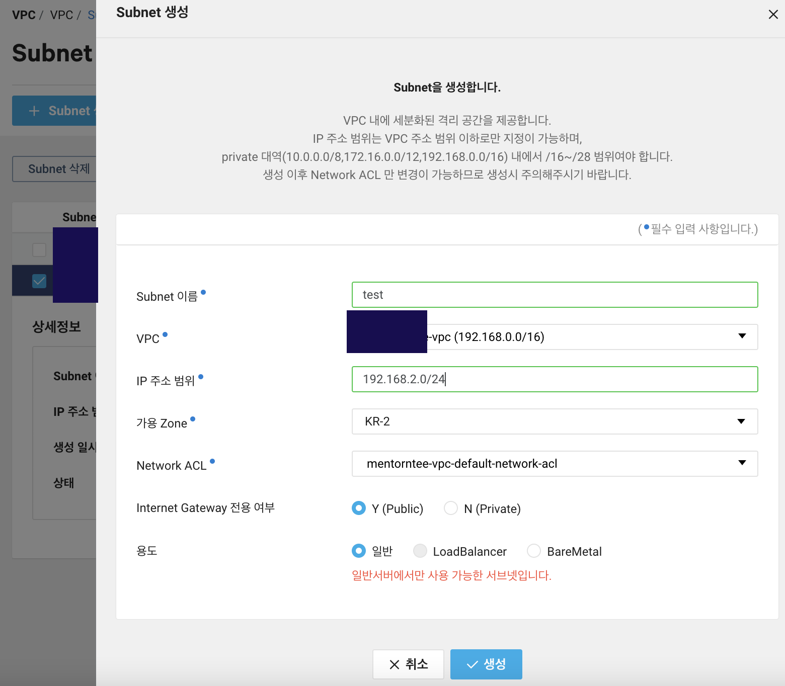아래 이미지와 같이 생성된 VPC의 가용범위 내의 IP주소를 생성하면 되고, Public 과 Private를 구분하여 용도에 맞게 생성하여 주시면 됩니다.