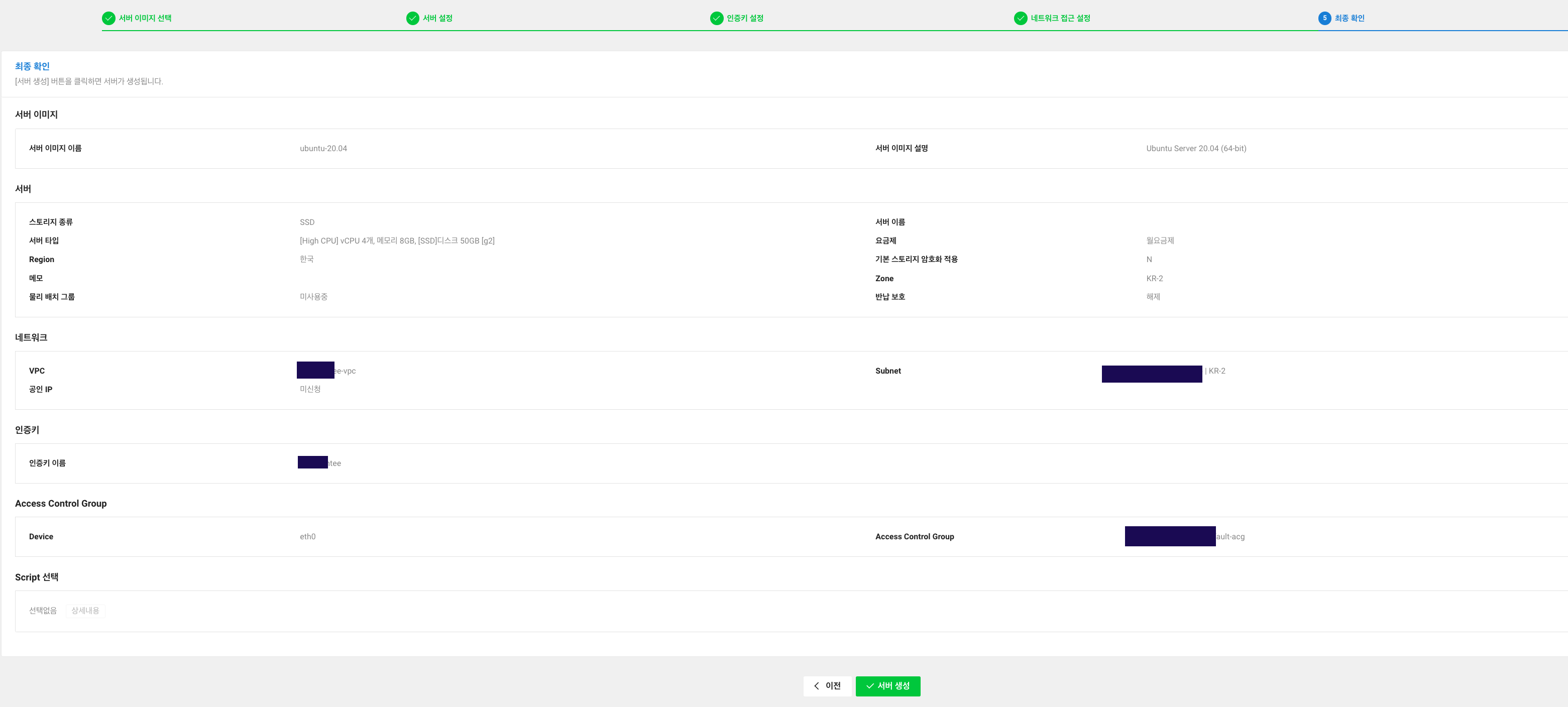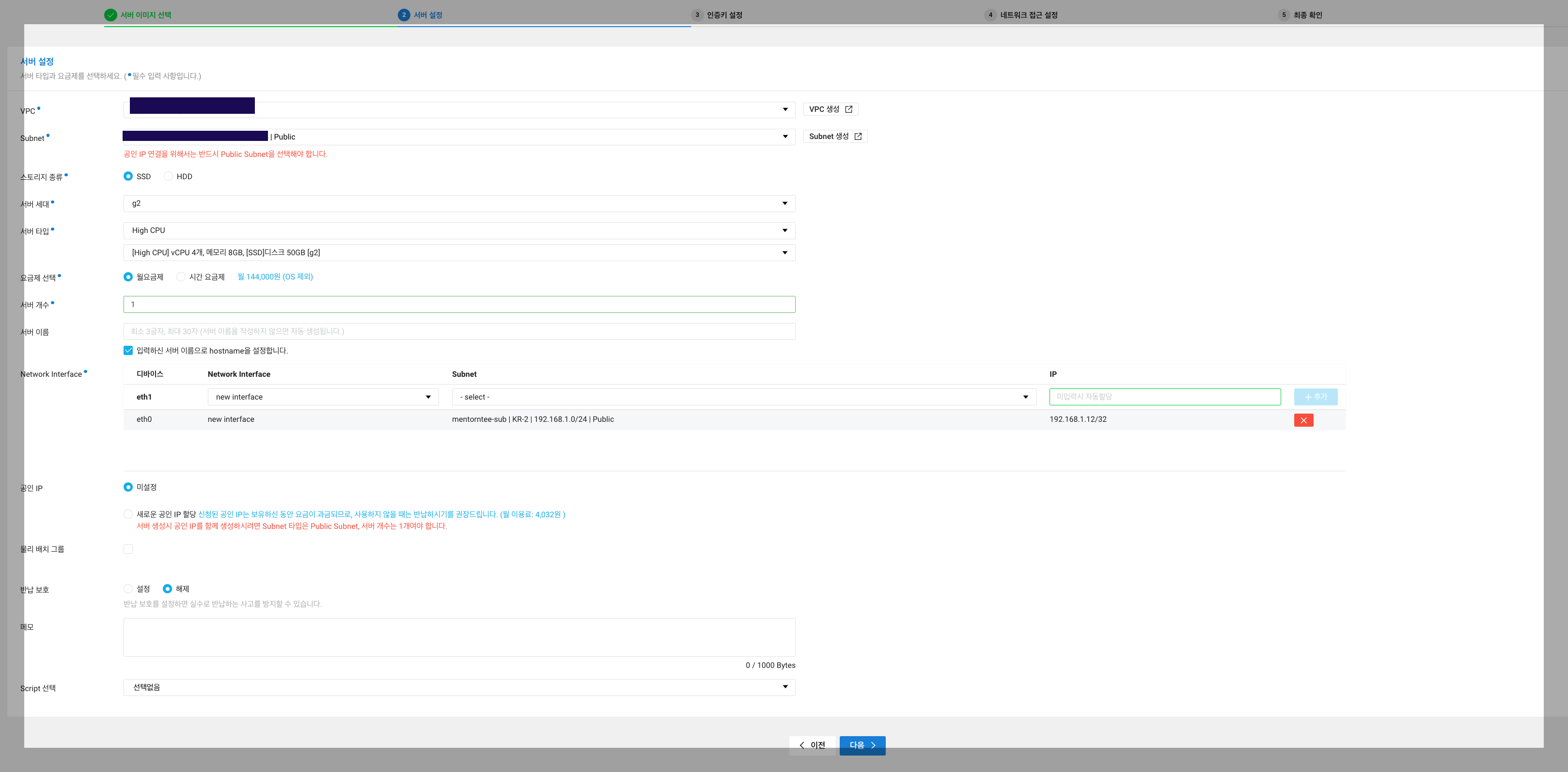 VPC, Subnet, 스토리지 종류, 서버세대, 서버타입, 요금제, 서버이름, Network interface, 공인 IP 사용 유무, 반납보호 설정, 메모, Script 선택 이 있습니다. 이 중 VPC, Subnet은 이 전에 설정했던 [참고] 네트워크 부분의 내용입니다.