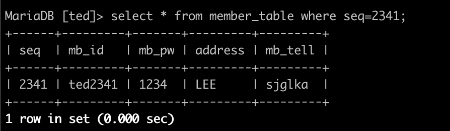 MariaDB [ted]> select * from member_table where mb_id="ted2341";