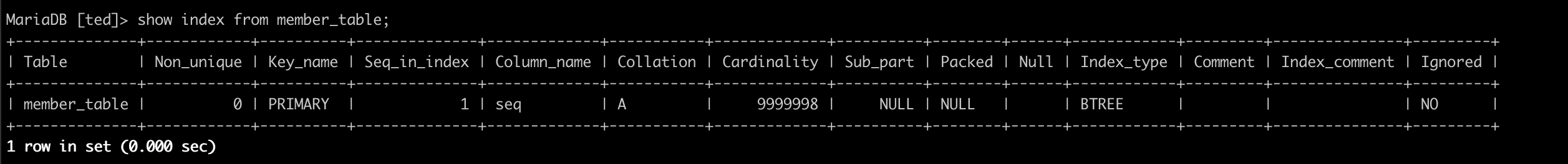 | member_table | 0 | PRIMARY | 1 | seq | A | 9999998 | NULL | NULL | | BTREE | | | NO |