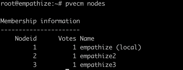 아래 명령어로 proxmox의 클러스터 정보를 확인 할 수 있습니다.